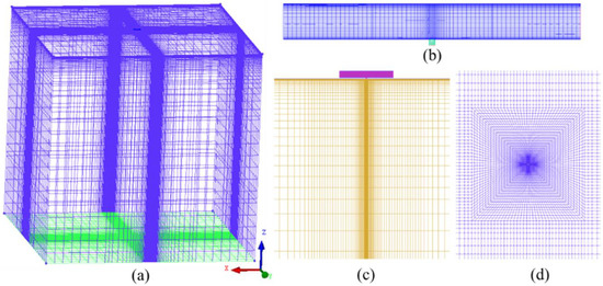 Computational meshes of fluid area: (a) mesh in the external space; (b) mesh in the pipeline and leakage section; (c) mesh in the local flow area in space below the leak hole; (d) mesh in the XY section.