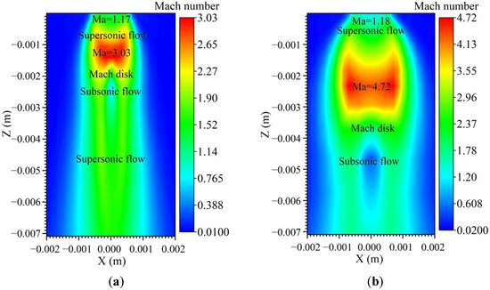 Cloud map of the Mach number in the local flow area under different initial leakage pressures: (a) initial leakage pressure of 1 MPa; (b) initial leakage pressure of 3 Mpa.