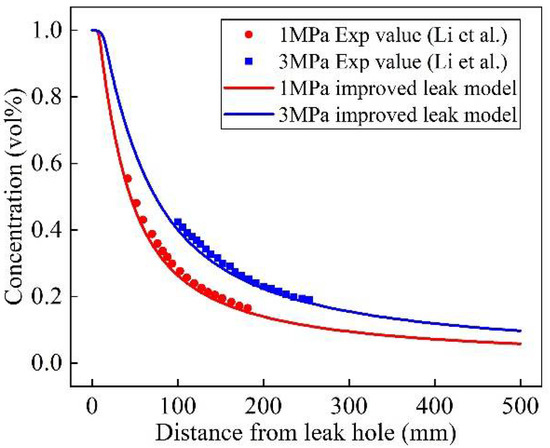 The comparison between the numerical simulation results obtained by the gas leakage model proposed in this paper and the experimental data of Li et al. [36] is shown in Figure 6. It can be seen from Figure 6 that when the initial leakage pressures were 1 and 3 Mpa, the experimental data and the numerical simulation results were in good agreement, and the concentration deviations of the leaked hydrogen at different positions of the jet axis were within 3 vol%.