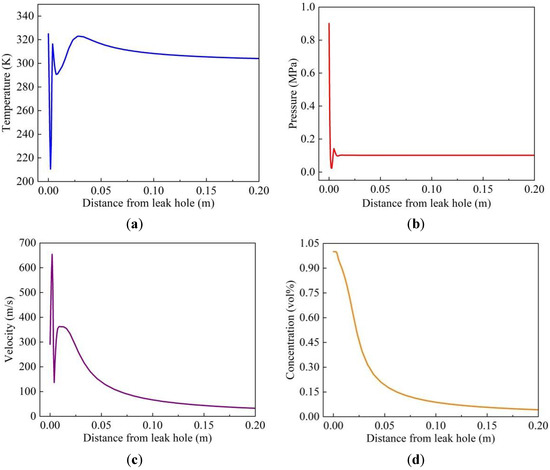 The initial leakage pressure was 2 Mpa, and the initial temperature was 360 K. The temperature of the external space was 300 K, and the pressure was 101.325 kPa. The temperature, pressure, velocity and concentration distribution curves of the leaked R290 gas on the jet axis in the local area obtained by the improved gas leakage model are shown in Figure 7, and the flow field distribution cloud maps of the leaked R290 in the local area are shown in Figure 8. It can be seen from Figure 7a–c that the temperature and pressure of R290 at the center point of the leakage section outlet were 328.9 K and 0.95 Mpa, respectively. The leaked R290 gas was still in an under-expanded state, and its Mach number was approximately 1.04, and the leakage velocity was greater than the local velocity of sound. After the leaked R290 entered the external space, the temperature and pressure of R290 in the direction of the jet axis decreased rapidly; the minimum values of the temperature and pressure were 199.8 K and 0.013 Mpa, respectively, and the velocity increased rapidly, reaching a maximum of 680.3 m/s. When the temperature and pressure of R290 reached the minimum level, the two parameters rose abruptly, and the gas velocity decreased sharply. After three sharp changes in the state parameters of R290, the pressure of R290 was very close to the atmospheric pressure, the temperature rose to a level slightly higher than the room temperature and the temperature and velocity of the leaked gas gradually decreased along the jet direction. The above phenomena can be explained as follows: the under-expanded R290 gas continued to expand after entering the external space as a supersonic jet. When it expanded below the atmospheric pressure, the leaked gas began to be compressed by the surrounding environment, and a Mach disk was formed inside the flow area. The temperature and pressure of the gas through the Mach disk were compressed to a higher level, and this part of gas then expanded and compressed again. However, with the continuous expansion and compression process, due to the viscous resistance and heat transfer between the leakage gas and external air, the pressure of the leaked gas gradually reduced. Eventually, the expansion and compression processes in the flow area disappeared, and a turbulent cloud with gently changing field strength was formed, and the leaked gas gradually returned to room temperature and atmospheric pressure through heat transfer with the external space.
