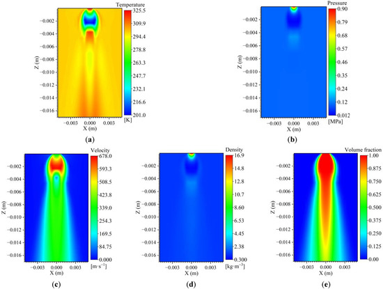 Cloud map of the field intensity in the local flow area below the leakage hole: (a) temperature cloud map; (b) pressure cloud map; (c) velocity cloud map; (d) density cloud map; (e) concentration cloud map.