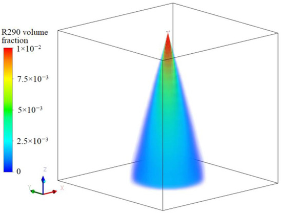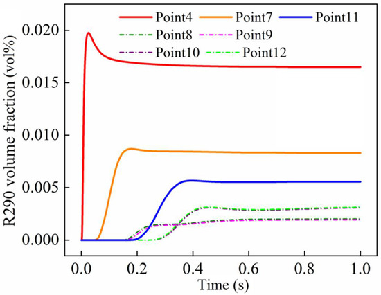 The variations in the R290 concentration with time at different locations in the far-field flow area is shown in Figure 9. The flow field distribution of the leaked R290 gas in the external limited space is shown in Figure 10. It can be seen from Figure 9 that with the increase in the leakage time, the gas concentration of each measuring point increased rapidly and then tended to be stable. In the direction of the jet, as the distance from the measuring point to the leakage hole increased, the concentration response time (the time from the beginning of the leakage to the concentration increase at the measurement point) was prolonged, and the concentration of R290 decreased. The concentration response times of points 7 and 11 were 0.06 and 0.2 s, respectively. After the concentration field in the local flow area was stabilized, the R290 concentrations of the points 3, 4, 7 and 11 were 86.5, 1.67, 0.85 and 0.56 vol%, respectively. Because the distance from point 3 to the leak hole was small, the concentration was higher, which was in the potentially flammable area, whereas at points 4, 7 and 11, the gas concentration had rapidly decayed to a lower level, which was in the nonflammable area. In the horizontal direction, the concentration response times of each measuring point was longer, and the R290 concentration was maintained at a low level. The concentration response times of points 8 and 9 were approximately 0.16 s, and the concentration values were relatively close, approximately 0.2 vol%. The concentration response times of points 10 and 12 were approximately 0.28 s, and the concentrations were maintained at 0.3 vol%. As the leaked R290 in the vertical direction was greatly affected by gas expansion process, the diffusion velocity of the gas was larger, the diffusion in the horizontal direction was mainly driven by the concentration gradient, and the diffusion velocity of the gas in the horizontal direction was much smaller than that in the vertical direction; thus, the concentration response time of each measuring point in the horizontal direction was longer. In addition, it can be seen from Figure 10 that the concentration distribution of the leaked R290 in the horizontal direction was centered on the jet axis and symmetrically distributed in the circumferential direction.