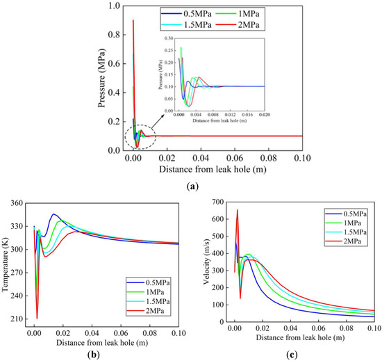 Field strength distribution of R290 on the jet axis under different initial leakage pressures: (a) pressure distribution; (b) temperature distribution; (c) velocity distribution.