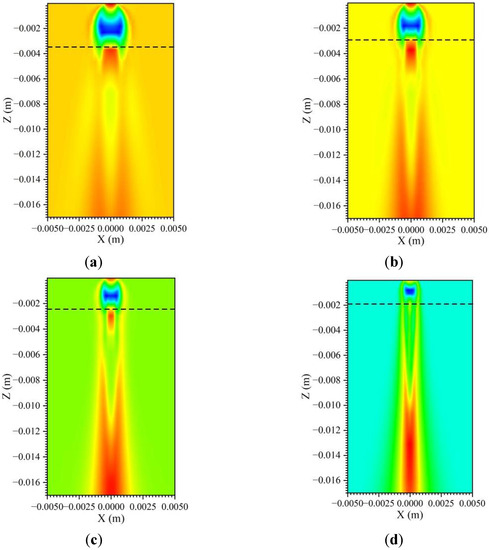 From Figure 8a–c, it can be seen that after the leaked gas entered the external space, it firstly formed an annular cloud under the leakage hole, and then began to spread to the far-field flow area. The temperature and pressure of the gas at the center of the cluster were the smallest, and the velocity was the largest. In the horizontal direction, the gas pressure from the inner to the outer in the cloud cluster gradually increased to the ambient pressure, the temperature distribution was similar to the pressure distribution and the isotherm in the flow area below the cloud cluster presented an M-shaped distribution. The reason for this was mainly that the continuous expansion and compression processes occurred only in the gas near the jet axis in the flow area, whereas the gas near the jet boundary would not undergo further expansion and compression because its pressure was very close to the ambient pressure, which led to the result that the temperature of the compressed gas at the jet axis was higher than that of the gas between the jet axis and the jet boundary.