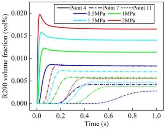 - The initial leakage pressure had a great influence on the position and circumferential diameter of the Mach disk formed by the leaked gas. As the initial leakage pressure increased from 0.5 to 2 MPa, the distances from the Mach disk in the local flow area to the leakage hole were approximately 1.7, 2.3, 2.9 and 3.5 mm, and the circumferential diameters of the Mach disk increased accordingly. With the increase in the initial leakage pressure, the concentration response times of different measuring points were shortened (For example, the response times of the points 7 and 11 were shortened from 0.18 to 0.05 and 0.5 to 0.2 s, respectively). The flammable area formed by the leaked R290 in the external space slightly increased in the horizontal direction, the flammable area increased significantly in the vertical direction, and its ranges were within 0.2, 0.27, 0.34 and 0.4 m, and the flammable area was mainly concentrated in the local area below the leakage hole.
