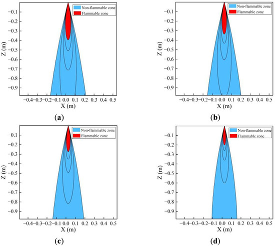 Variations in the flammable area of the external space under different initial leakage pressures: (a) 2; (b) 1.5; (c) 1; (d) 0.5 MPa.