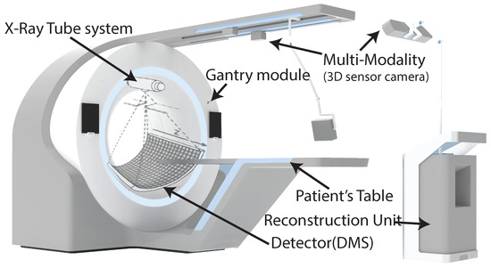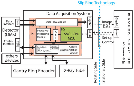 Figure 1, the CT scanner consists of an X-ray tube or source, a gantry module, a detector system (DMS), collimators, a motorized patient’s table, and an image reconstruction unit. For controlling and synchronizing all these components, different FPGAs are used in the CT scanner [