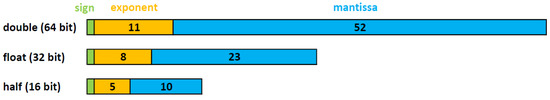 To pre-select the data formats and reduce the size of the design space, we use a top–down approach. At the beginning, we decided to explore only standardized data formats that are also implemented in the new commercial architectures, such as GPUs, and TPUs. In this way, we focused on floating-point and fixed-point representations.