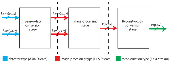 Contributions. In this article, we propose various hardware optimizations of the X-ray pre-processing step in interventional CT. It involves the optimization of the numerical computation of total attenuation values and its hardware acceleration. This pre-processing step is also called I0-correction. First, we apply the pre-processing algorithm on the digital detector signals without the intermediate step to convert them to intensity images. Consequently, the total attenuation computation formula is simplified in terms of arithmetic and hardware complexity. Second, we implement a custom hardware accelerator as dataflow architecture, called the CT pre-processing core, that pre-processes the raw sensor data on the fly, without storing data in external memory. Furthermore, this core is designed using high-level synthesis (HLS), and it is configurable for various encoding and data widths of fixed-point and floating-point representations. In addition to the proposed pre-processing optimization, we integrated the implementation of the CT pre-processing core in an open-interface CT assembled in our laboratory. The proposed core implemented on FPGA can be integrated directly with the data acquisition system (DAS), which collects the detector signals and forwards the pre-processed data to the reconstruction system.