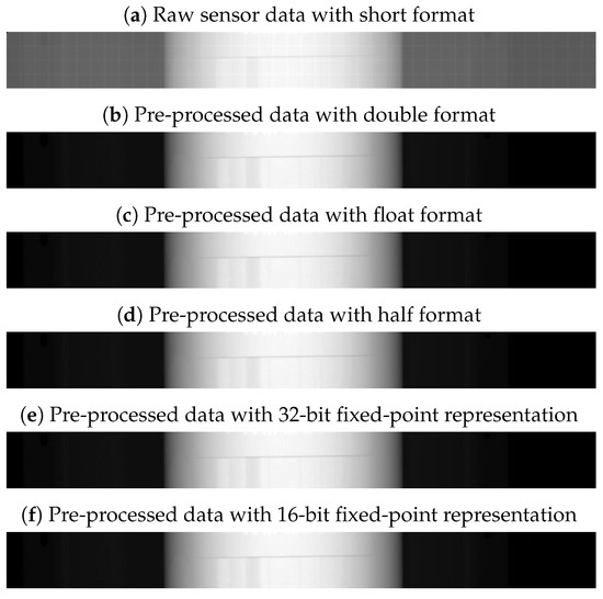 Finally, we perform a design space exploration (DSE) to find which real number representation and data format better fits the pre-processing step for interventional CT applications. The DSE considers the different data representations as input variables and the qualitative and quantitative metrics, such as image quality, execution time, and the X-ray dose as decision variables. We systematically pre-select the input data formats based on the raw sensor and the reconstruction data formats. In addition, we pre-select specific metrics for estimating hardware costs, such as execution time, data width, and memory bandwidth required per pixel. Apart from that, we use image quality metrics, such as mean square error (MSE) of the 2D image and