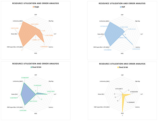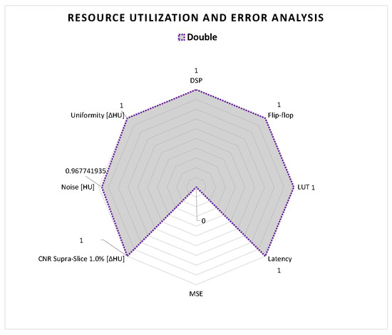 For the hardware performance evaluation, we considered the resource utilization of the FPGA and the execution time of the different solutions. In our case, we only analyzed the execution time of the CT pre-processing core, which is expressed as latency from the Vitis™ HLS tool. For analyzing the resource utilization of the FPGA, we considered the configurable blocks and memories mostly used for image processing applications. These are digital signal processing (DSP) blocks, flip-flop registers (FF), BRAM memory, and look-up tables (LUTs) for the combinatorial logic [