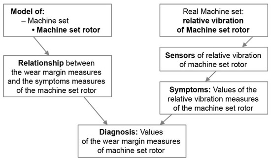 Maintenance-oriented diagnosis can be improved by dividing the machine set into functional units and replacing the term of condition with the term of wear margin. The description of diagnostic relations in real machines is difficult; a sufficiently detailed description is possible on models of machines. In diagnosis, the relationship between the wear margin measure and the symptom measure must be reversible. The algorithm of diagnosing the machine set rotor using its relative vibrations is shown in Figure 1.