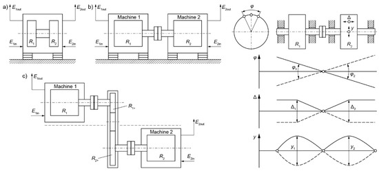 Rotors of the driving machine-driven machine set (on the left) and vibrations of the two-mass machine set rotor (on the right): (a) one rotor with one shaft, (b) one rotor with shafts connected by a coupling, (c) two rotors of a machine set with a transmission, E1in—energy powering the driving machine, E1out—energy carried away from the driving machine, E2in—energy delivered to the driven machine, E2out—energy at driven machine output, R1—rotor disc of the driving machine, R2—rotor disc of the driven machine, R1+, R2+—rotor discs of the transmission, φ—angular displacement of torsional vibration, Δ—displacement of axial vibrations, y—displacement of radial vibration.