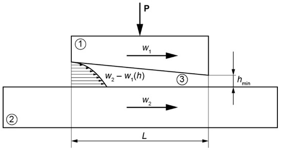Tribological model of slide bearing. The converging gap and the distribution of fluid speed in the gap: 1, 2—elements forming a node moving at speed w1 and w2: w2 > w1; 3—separating fluid; L—length of the gap; hmin—minimum height of the gap; P—normal force exerting a load on the node.