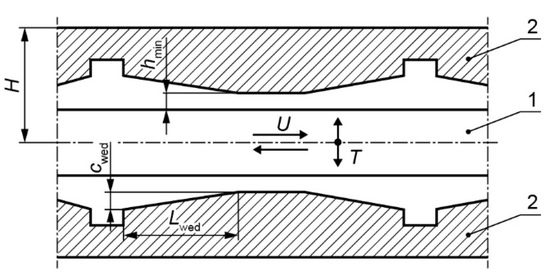 The tribology modeled the slide bearing as two solid bodies with a converging gape filled with fluid. If between the interacting solid bodies (structural elements) a narrow and converging gap exists, filled with fluid, then a pressure is created in the fluid [32]. The pressure in the gap results from the effect of oil wedge and/or extrusion of fluid from the gap. The effect of the oil wedge occurs when the gap walls are convergent (in the geometric sense, i.e., the space between the walls becomes narrower in the direction of the motion), and along the gap, there is a relative speed of the walls U = w2 − w1, Figure 3 [32,33].