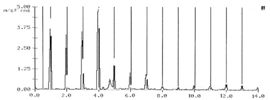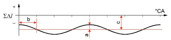 - In these working states, the driven machine can be in the working mode MU > 0 or run idle, without a load, MU = 0. For a constant average angular speed, the value of the components of Equation (6) with respect to time can be considered as periodic signals, and each of them can be presented as the sum of harmonic signals with specific values of the harmonic order, amplitude and phase angle. It is possible to determine the reference spectrum of the driving moment and effective moment. Additionally, the reference spectrum of the friction moment can be determined. It can be assumed that for a given machine set rotor and for a specific average rotary speed, there exists a model of value as a function of the rotation angle and a spectrum model of the angular acceleration . Comparing the real value as a function of the rotating angle or real spectrum with their respective models, we can draw conclusions on the changes in the moments of a machine set.