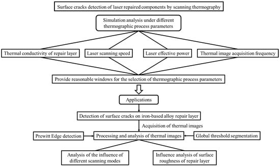 Laser spot thermography is an important way to realize laser thermography. In this paper, in order to improve the detection accuracy and efficiency of laser spot thermography, the optimization of thermographic process parameters and the development of thermal image processing algorithm are studied. Firstly, a simulation model with a vertical surface crack was established based on the finite element method, and the surface temperature response of the model under different heat source parameters was calculated. Based on the simulation results, the influences of material properties, laser power and laser scanning speed, thermal image acquisition frequency on the temperature gradient at the crack were analyzed, and the windows for selecting laser scanning parameters were proposed for iron-based and nickel-based alloy materials. The optimized thermographic process parameters were applied to the surface crack detection of real repaired components, and the thermal image sequence based on laser scanning was used for post-processing. Then, the processing results of the one-order gradient algorithm, the second-order gradient algorithm and the edge detection algorithms were compared. The results show that the edge detection algorithm based on Prewitt operator has high precision in locating crack edges, and can achieve fast crack extraction with high signal-to-noise ratio (SNR). The detection sensitivity of crack width can reach 10 μm. To further study the influence of surface roughness on thermographic detection, repair layer with and without polishing process are detected. The results show that the periodic temperature distribution is caused by the periodic cladding tracks. When the amplitude of surface fluctuation is small, the global threshold segmentation algorithm can effectively eliminate the cladding track noise. When the amplitude of surface fluctuation is large, cladding noise has a great influence on crack identification results. The framework and technical route are shown in Figure 1.