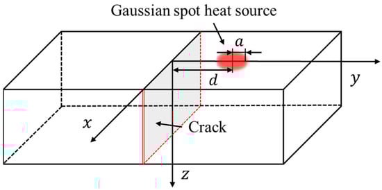Consider the semi-infinite model, which contains infinite surface vertical cracks. On the model surface, axis is perpendicular to the crack direction and axis is parallel to the crack direction, and circular Gaussian pulse heat source excitation is applied at a distance of d from the crack, as shown in Figure 2. The total energy obtained by the model is , and based on the heat conduction Equation (2) and the boundary conditions, the temperature distribution along y-axis can be obtained [22]: