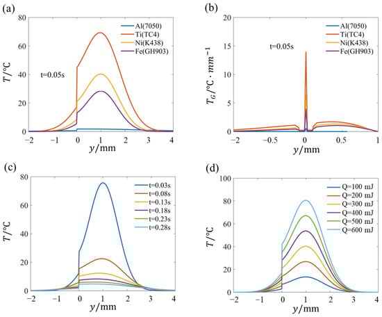 Analysis of temperature response based on circular Gaussian pulse excitation: (a) Temperature distribution along the y-direction of different materials; (b) Temperature gradient distribution of different materials along the y-direction; (c) Temperature distribution along the y-direction at different times; (d) Temperature distribution along the y-direction of different .