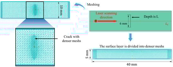 The simulation model is established using ABAQUS as shown in Figure 4 [31]. The size of the model is 40 mm × 10 mm × 5 mm, and the model includes a vertical surface crack with a length of 6 mm, a width of L and a depth of 1 mm. In order to improve the accuracy of calculation and reduce the calculation time, more dense mesh is only set at the crack and near the crack. A point laser is scanning and exciting along the horizontal centerline of the model surface, and the heat flux density of the point laser satisfies a Gaussian distribution [24,32]:
