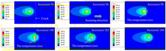 The scanning speed of laser spot is set as 10 mm/s, the total scanning time is 4 s, the acquisition frequency of thermal images is 50 Hz, the total number of thermal images is 200, the radius of the heat source is 1 mm, and the effective power of the laser is 1200 mW. Taking nickel-based alloy K438 as the model material, and the thermodynamic parameters of the material are shown in Table 1. When the laser spot scans in the direction perpendicular to the crack and approaches the crack, as shown in Figure 5, the conduction of heat wave will be hindered by the crack boundary, so there is an obvious temperature rise at the crack edge. The surface temperature gradient can reflect the shape and geometric distribution of the crack. When the laser gets closer to the crack, the range of the thermal barrier influence expands and the temperature rise increases, and the temperature rise is the largest when the center of the point laser overlaps with the crack.