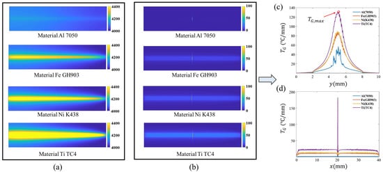 Based on Equations (3) and (4), we perform the calculations by MATLAB, and the thermal response of the cracked model under pulse excitation is obtained, as shown in Figure 3. Thus, the influence of material properties and laser power on the distribution of surface temperature and temperature gradient can be analyzed, which provides reference for the simulation and experiment. Several commonly used materials are selected, and their thermodynamic parameters are shown in Table 1. The distance between the circular Gaussian heat source and the crack is set as = 1 mm, the spot radius of the heat source is set as = 1 mm (at of the intensity), the total energy of the pulse heat source is set as = 300 mJ, and the excitation time is set as 0.3 s. The crack width is set as 40 μm and the thermal resistance coefficient at the crack is . At 0.05 s after excitation, the surface temperature distribution and temperature gradient of the model along y-axis are shown in Figure 3a,b, where the surface temperature gradient is defined as: