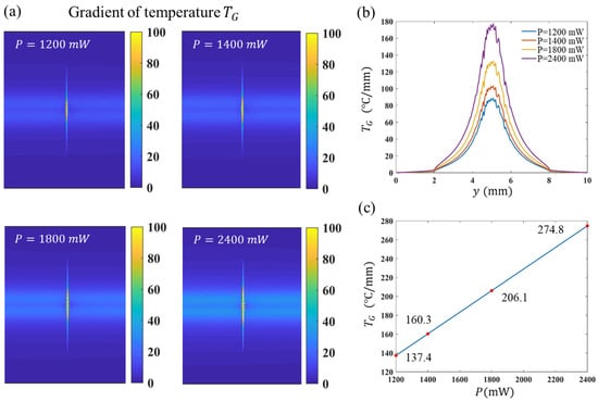 Figure 8 shows the calculation results of field under different laser effective powers, and the results of the display range with fixed temperature are shown in Figure 8a. With the increase in laser effective power, the heat input per unit time of the model increases, and the thermal resistance effect of the crack on the heat wave increases, so does the amplitude of the temperature gradient. Figure 8c shows that there is a linear relationship between the amplitude of and the effective power of the heat source. The increase in effective laser effective power will increase the heat affected zone, accordingly, for materials with low thermal conductivity, the increase in laser effective power is generally used to expand the heat affected zone and improve the quality of detection. However, excessively high laser effective power will cause damage to the specimen surface, so the appropriate laser effective power should be selected under the premise of considering the material properties.
