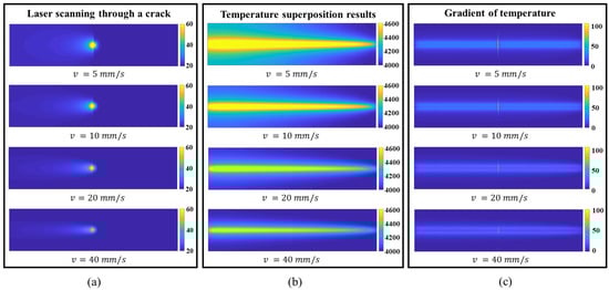 Figure 9. Crack detection at different laser scanning speed (= 1800 mW, = 50 Hz): (a) temperature field of laser scanning through the crack; (b) superposition results of ; (c) temperature gradient field ( ). - (3)