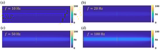 at different thermal image acquisition frequencies ( = 10 mm/s, = 1200 mW and acquisition time is 2 s): (a) = 10 Hz; (b) = 20 Hz; (c) = 50 Hz; (d) = 100 Hz.