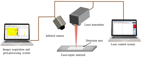 The system adopted in the experiment is shown in Figure 11 and Figure 12a, which mainly includes laser transmitter, image acquisition device, infrared camera and tested components [18]. VarioCam HR infrared camera produced by Infratec in Germany is used, with a resolution of 1024 × 768 pixels, the measurable temperature range is −40~1200 °C, the measurement accuracy is ±1 °C or ±1%, the temperature resolution (30 °C) is up to 0.02 K, and the maximum thermal image acquisition frequency is 30 Hz.