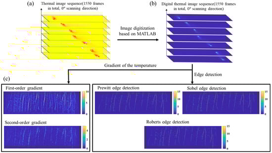 The thermal image processing and analyses are at the core of crack detection quality. Therefore, we take thermal images scanned along the direction of 0° as an example to show the process of thermal image processing, as shown in Figure 13. Firstly, the infrared camera is used to collect the n-frame thermal image in the laser scanning process, n = 1550. Then, MATLAB is used to digitize the thermal image sequence, as shown in Figure 13b. Further analysis is conducted based on digital image processing technique. The first image is taken as the reference image, representing the background temperature field without thermal excitation. The temperature change sequence is obtained by subtracting the reference image from other frames, and the post-processing analysis is conducted on this basis. In the post-processing process, the shape and geometric distribution of cracks are extracted by the enhancement and segmentation algorithms of temperature change images. The commonly used post-processing algorithms include first-order and second-order gradient algorithms, edge detection algorithms, etc., and the detection quality is different to some extent [10,38,39,40,41].