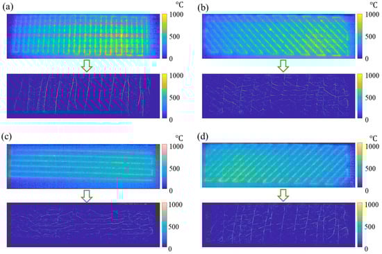 Temperature field of laser scanning in four directions and extraction results of crack morphology: (a) 0° direction; (b) 45° direction; (c) 90° direction; (d) 135° direction.