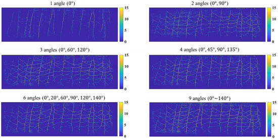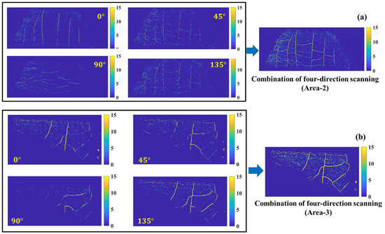 Therefore, several combinations of laser scanning modes are considered to achieve comprehensive crack detection. After the collection and processing of thermal image, the detection results are obtained as shown in Figure 15. When the scanning combination along 0° and 90° is adopted, the horizontal and numerical crack detection can be achieved, but the detection effect along oblique crack is not good. When the scanning combination of 0°, 45°, 90° and 135° is adopted, better detection effect can be obtained, and the resulting image contains more crack details. When six or more scanning directions are used for detection, the detection effect is not significantly improved and the detection efficiency is low. Therefore, it is recommended to use the scanning combination of 0°, 45°, 90° and 135° to ensure the detection effect and efficiency.