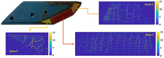 The edge area of the plate-like specimen shown in Figure 12b is repaired using LENS technique. The repair layer is made of iron-based alloy, and the surface cracks are formed in the process of manufacturing. The repair layer is divided into three main areas: Area-1, Area-2 and Area-3, where the area of Area-1 is 8.4 × 2.2 cm2. Area-1 was detected by a combination of various scanning modes. As shown in Figure 12c, assuming that the direction perpendicular to the molten pool is 0°, and the angle between the scanning direction and the 0° direction is , The scanning combination modes are shown in Table 3. The line spacing of the laser scanning path is set to be 3 mm to improve the detection efficiency.