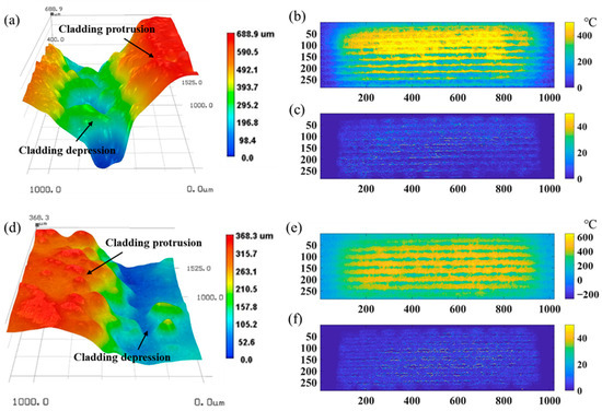In the processing of thermal images, the temperature change fields excited by laser in four directions of 0°, 45°, 90° and 135° are averaged to obtain the combined form of temperature change field. Then, the image dilation algorithm is used to process the pixels with temperature higher than 2 °C in each frame of thermal images, and further obtain the surface temperature distribution formed by the cladding track structure [18]. In the temperature field shown in Figure 19e, as the specimen surface is relatively smooth, the surface temperature distribution under laser excitation is relatively uniform. As shown in Figure 19b or Figure 20b,e, periodic cladding track structure exists in repair area 1, repair area 2 and repair area 3. Under laser excitation, the surface temperature field also presents periodic distribution, which is consistent with the cladding track structure. With the increase in surface fluctuation amplitude of repair layer, periodic temperature distribution becomes more obvious.