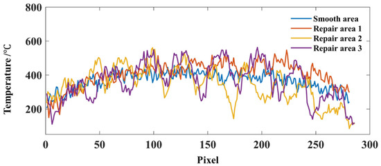 In Figure 19b,e and Figure 20b,e, the vertical line at the position of the 800th pixel on the horizontal axis is selected, and is perpendicular to the cladding track. The temperature distribution curves along are drawn in the combined temperature change field, as shown in Figure 21. Due to the same laser scanning parameters and thermal image processing process, the temperature distribution curves of several surface structures are similar. The distribution of temperature change under the influence of cladding track structure is periodic, and the periodicity of repaired areas 2 and 3 is more significant, while the temperature fluctuation of the smooth area is small.