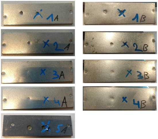 Nine samples, divided into two series. The A-series consists of four samples with a thickness of 2.5 mm (1–4) and sample 5A is 3.15 mm thick. The B-series only consists of four samples with a thickness of 2.5 mm. The spot weld highlighted by the blue cross is the inspected spot weld for each sample.