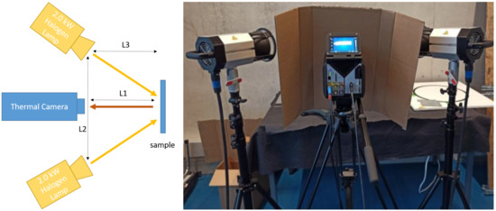 Two halogen lamps of 2 kW each are used as a heating source. These lamps are from the brand Edevis and can be found online as the OTvis system. The lamps are mounted on a tripod and placed on either side of the thermal camera. The measurement setup for the light heating experiments can be found in Figure 2, and the according parameter values are discussed in Table 2.