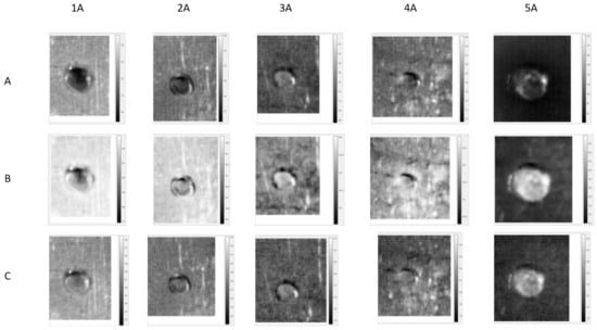 Images taken from the principle component analysis performed on the thermal data captured using induction heating of the front side of the sample. Experiment (A) is performed using an induction time of 5 s, experiment (B) has an induction time of 10 s, and the sample was heated for 19 s in experiment (C).