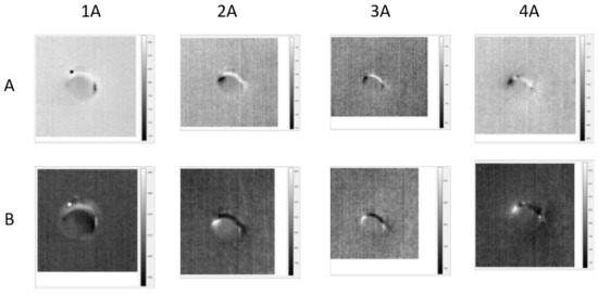 Results of the PCA processing of the pulse thermography data. Experiment (A) is conducted using an amplitude of 8 and a pulse duration of 1 s. Experiment (B) is conducted using the same amplitude and a pulse duration of 3 s. There are no data for sample 5A since the processing did not result in useful information. Sample shows a similar result to previous results, namely, no closed boundary can be detected.