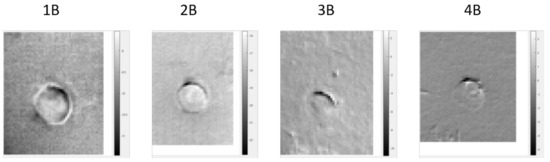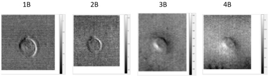 Since induction thermography is a fast technique and it results in qualitative images, only this technique is used for the inspection of the remaining four B samples. The optimal parameters found during the experiments of series A can be found in Table 7. These parameters are used in the inspection of the samples of the B series. In contrast to the processing of the A series, the thermal data of the B series are processed using FFT and PCA. Both techniques resulted in decent quality images for this series. The results of the FFT processing of the front heating of the samples can be seen in Figure 10, and the PCA results can be found in Figure 11. The processed images related to back heating the sample can be seen in Figure 12 and Figure 13.
