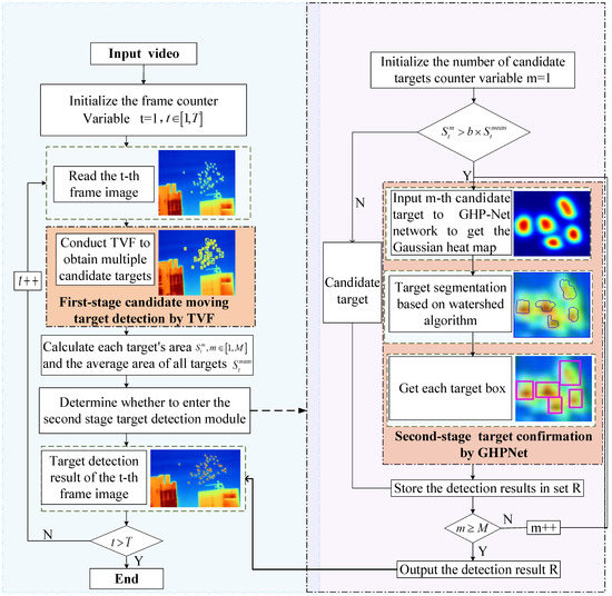 The flow of our algorithm is shown in Figure 1, which is mainly composed of first-stage moving target detection based on TVF and second-stage target confirmation by GHPNet. Firstly, using the motion characteristics of the bird flock, TVF is performed on the infrared video sequence to obtain the candidate motion region, that is, a single bird or multiple birds with a certain overlap in space. Secondly, the size consistency of birds in the flock is used to screen whether the candidate target enters secondary detection. Aiming at the problem that the traditional detection network is difficult to distinguish individuals in a dense flock of birds, a bird target detection network based on Gaussian heat map perception was then designed and called GHPNet, which can predict the Gaussian heat maps with clear boundaries between targets. Finally, the predicted Gaussian heat map is post-processed by the watershed algorithm to obtain each bird in the overlapping region.