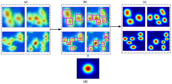 As can be seen from Figure 3, in the infrared video sequence image, the bird target presents the phenomenon that the central area is the brightest and the brightness gradually becomes darker as it expands outward, and this case is just consistent with the distribution of the Gaussian model. Inspired by this observation, aiming at the problem that it is difficult to distinguish individual birds in the gathering and the overlapping regions; the Gaussian heat map sample annotations are automatically generated for the manually selected bird targets. By using a size-adaptive two-dimensional Gaussian kernel, the ground truth Gaussian heat map can be quickly and automatically generated for multiple targets in a given candidate target area. For candidate target image block screened by the TVF algorithm, all birds existing in the scene are firstly artificially labeled with a set of rectangle boxes , which corresponding center point set and maximum side length set are and , respectively. The generation process of the ground truth of the Gaussian heat map is as follows: given a candidate target dense region screened by the TVF algorithm, after manually selecting bounding boxes for all targets, the Gaussian heat map of image patch is automatically realized by assigning the corresponding Gaussian value within each target box and assigning zero outside all the bounding boxes. In other words, for any pixel in the image block , the bounding box where it is located is judged. If it belongs to a certain box , the true value of its Gaussian heat map is calculated using the Gaussian kernel function by its distance from the center point and side length as