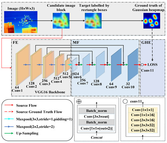 The constructed network needs to predict the heat map information of all bird targets. The predicted value should be the highest in the center of each bird and gradually decreases outward along the center. This is a very challenging task. The GHPNet network takes an image of the size as input, and outputs a pixel-wise Gaussian heatmap of the same size, not a binary map of whether it belongs to the target. As shown in Figure 4, the GHPNet consists of three components: a feature encoder (FE), multi-scale fusion (MF), and Gaussian heap estimator (GHE). The parameter settings of each module are shown in Table 1.
