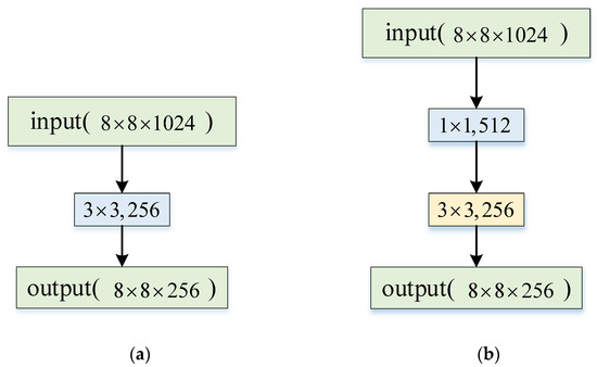Figure 5 shows the original two target feature maps and their corresponding feature results obtained by max-pooling and maximum-no-pooling processing. As can be seen from Figure 5, maximum-no-pooling can highlight the target area better than max-pooling, which can ensure that the target will not easily be lost in the deep layers of the network. After convolutions, the output feature of each scale from MF are concatenated with the output feature from FE at the same scale before passing through a specified fusion layer, which comprises of a convolution layer, with a batch-norm layer and a convolution layer, with a batch-norm layer. Additionally, for reducing the network parameters, a convolution is added before a convolution layer in which means the number of channels of the output feature map. Figure 6a,b are the processing procedures with and without convolution: the input is and the output is . The number of parameters corresponding to two different convolutions are and , respectively, which are calculated as , . It can be seen that applying convolution can save 27.8% of the computation compared to not using convolution. By adding convolution before the convolution of each layer, the MF module can effectively reduce the amount of network parameters and thus save the time complexity of the network.