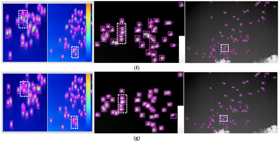 To further demonstrate the advantages of our method, we show the subjective performance comparisons in Figure 7. Three test images and their expanded versions of the red boxes are shown in Figure 7a,b, respectively. The detection results corresponding to different methods are given in Figure 7c–g. The actual numbers of birds in the left and the right regions cropped from the first image in Figure 7a are 35 and 47, which is shown in the first and the second column in Figure 7b, respectively. As shown in the first and the second columns in Figure 7c–g, respectively, the number of birds detected by Mask R-CNN [18] is 30 and 41, with 15 and 35 detected by DRU-Net [31], with 27 and 37 detected by DNA-Net [32], with 28 and 42 detected by YOLOv4 [24], and with 32 and 45 detected by our algorithm. The actual number of birds in the second image in Figure 7b is 38, as shown in the third column of Figure 7c–g, the number of the detected birds of Mask-RCNN [14], DRU-Net [16], DNA-Net [32], Yolov4 [12], and our method is 33, 30, 34, 34, 37, respectively. The number of birds in the third image in Figure 7b is 74. For the case where the birds appear more densely, the detection numbers of Mask-RCNN [14], DRU-Net [16], DNA-Net [32], Yolov4 [12], and our method are 57, 62, 67, 80, and 73, as shown in the fourth column in Figure 7c–g, respectively. It can be seen that the number of bird objects detected by our method is closest to the ground truth in both our captured dataset and the more densely bird-dense TIV [36] dataset. In order to further clearly show the detection effect of each algorithm, four white dashed boxes are specially marked in three images in Figure 7. Taking the first white dashed box in the first image as an example, the number of the detected birds of Mask R-CNN [18], DRU-Net [31], DNA-Net [32], YOLOv4 [24], and our method is 5, 1, 5, 4, and 6, respectively. It can be seen that all of these comparison methods miss a certain number of targets compared to the actual number of six targets, however, only the detection result of our method is completely correct. These four comparison methods have the problem of identifying multiple birds in dense areas as independent individuals. Compared to these methods, our algorithm has absolute advantages.