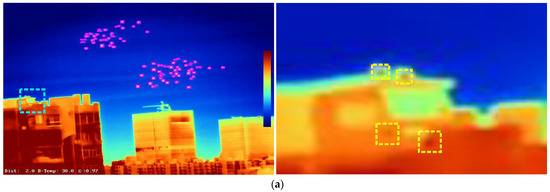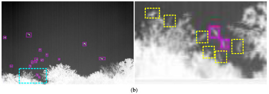 The challenge of the proposed method is the detection of weak and small targets in the case of complex background interference. Figure 10 shows the target detection results in a complex background. The left image is the original image, and the right image is an enlarged image corresponding to the cyan box in which the purple box is the detected target and the yellow dotted box is the missed target. As can be seen from the right image of Figure 10, due to the small size, poor contrast, and complex background, the target detection performance is decreased to a certain extent, which is a challenge faced by most infrared target detection algorithms and is also one of our works to focus on in the future.
