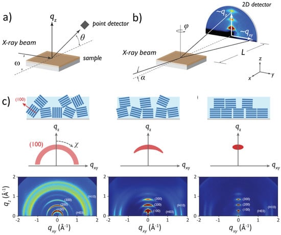 (a) Schematics of a Bragg–Brentano geometry X-ray diffraction setup. (b) Schematics of a GIWAXS geometry diffraction setup. (c) Archetypical GIWAXS images showing the correlation between diffraction peaks in the out-of-plane and in-plane directions of space and the orientation of polymer stacks. Randomly oriented crystallites would give rise to Debye diffraction rings (left) instead of well-defined spots (right). Adapted with permission from the American Chemical Society, copyright 2012 [].