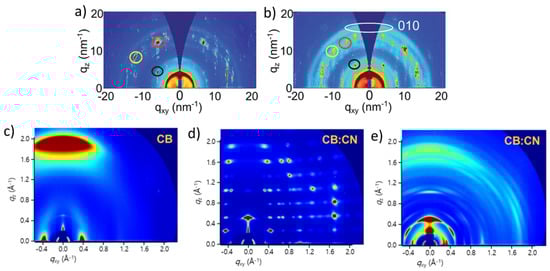 (a,b) GIWAXS diffraction patterns of P3HT:PCBM films post-treated with chlorobenzene and toluene vapours, respectively. The dominant Bragg diffraction peaks corresponding to PCBM packed in a single crystal-like fashion are marked as black, yellow and red circles. Adapted with permission from the Royal Society of Chemistry, copyright 2016 []. (c) GIWAXS diffraction patterns of a thin film of pristine CITIQ-4F processed from chlorobenzene; (d) GIWAXS diffraction patterns of a thin film of pristine CITIQ-4F processed from chlorobenzene containing 2% of chloronaphtalene; (e) GIWAXS diffraction patterns of a thin film of a PTB7-Th/CITIQ-4F blend processed from chlorobenzene containing 2% of chloronaphtalene. Adapted with permission from the American Chemical Society, copyright 2019 [].