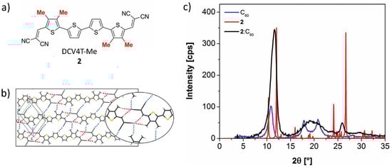 (a) Molecular structure of oligothiophene 2; (b) X-ray single-crystal structure of derivative DCV4T-Me 2 showing the molecular packing along the ab plane of the unit cell. Derivative 2 exhibits a layer arrangement in which molecules form rows interacting via four weak CH····NC hydrogen bonds between vinyl and methyl hydrogens and the dicyanovinyl groups (red dotted lines); (c) GIXRD diffractograms of powder C60 (blue line), active layer blend of 2 and C60, and calculated powder diffractogram of 2 from X-ray crystal structure (b). Adapted with permission from the Wiley VCH, copyright 2012 [].
